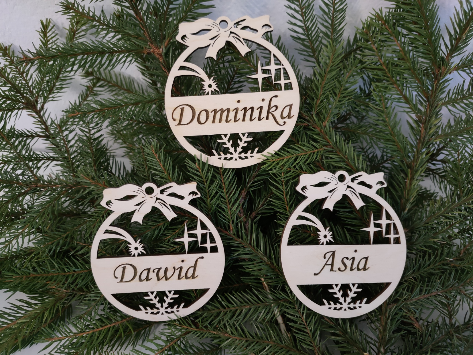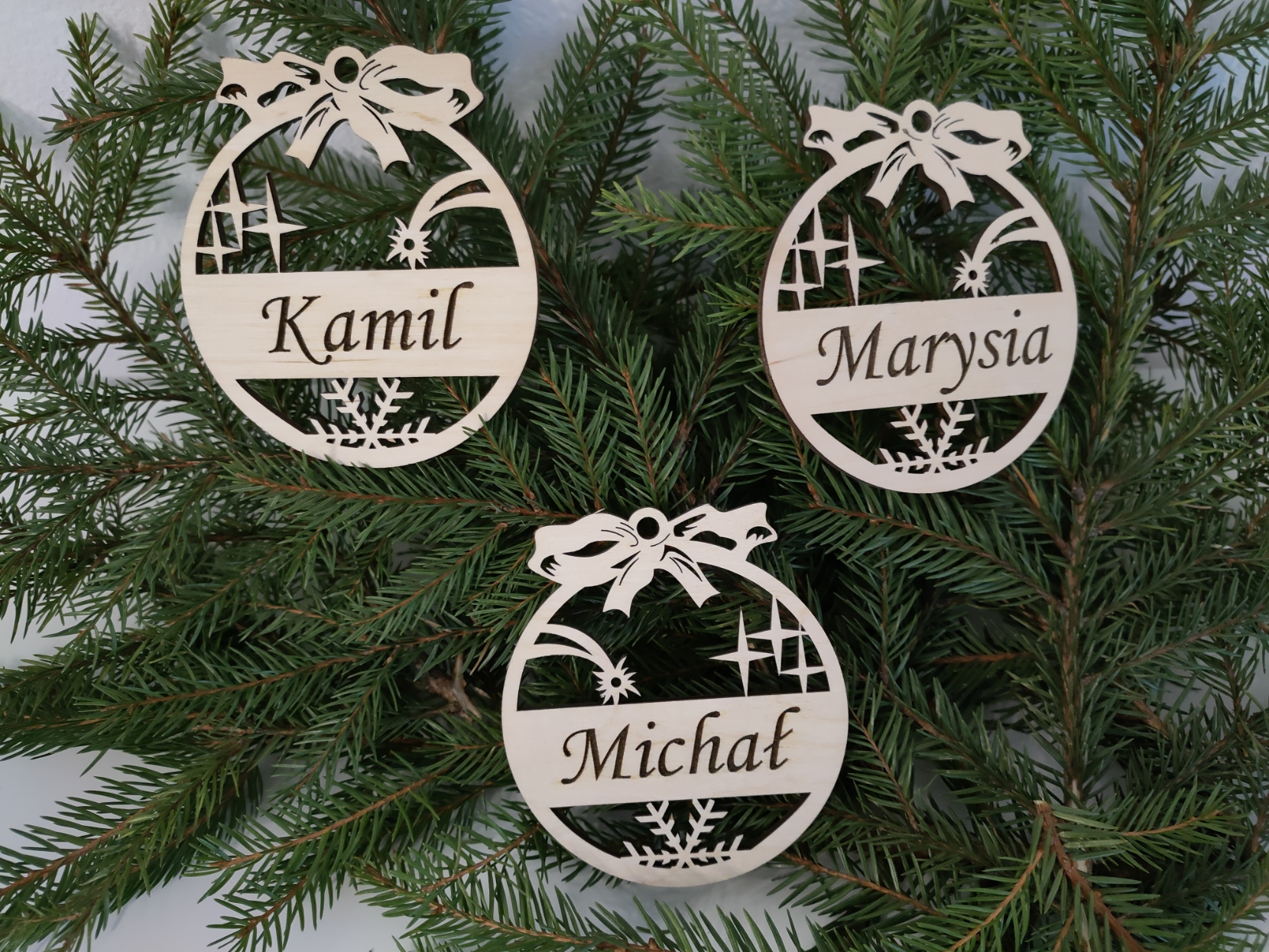 Bombki wykonywane są z wysokiej jakości sklejki, a imię grawerowane jest laserowo po obu stronach. Subtelne wykończenie i delikatna faktura drewna sprawiają, że ozdoba pięknie prezentuje się w świetle choinkowych lampek i doskonale komponuje z naturalnymi dekoracjami świątecznymi.