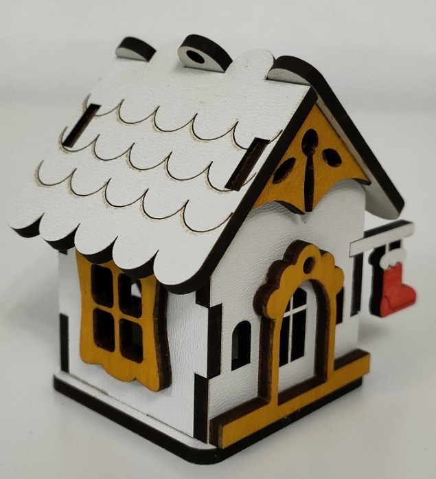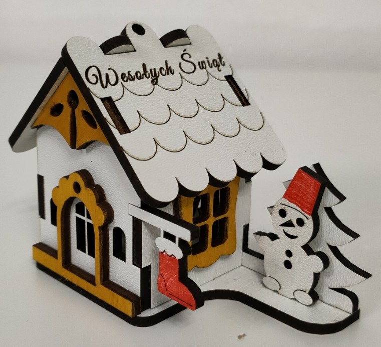Domek wykonany jest z wysokiej jakości sklejki o naturalnej strukturze i subtelnym grawerze. Każdy model inspirowany jest tradycyjnymi świątecznymi chatkami, co nadaje mu niepowtarzalnego uroku. Można go pozostawić w naturalnej formie lub udekorować farbami, światełkami czy sztucznym śniegiem, tworząc spersonalizowaną ozdobę.