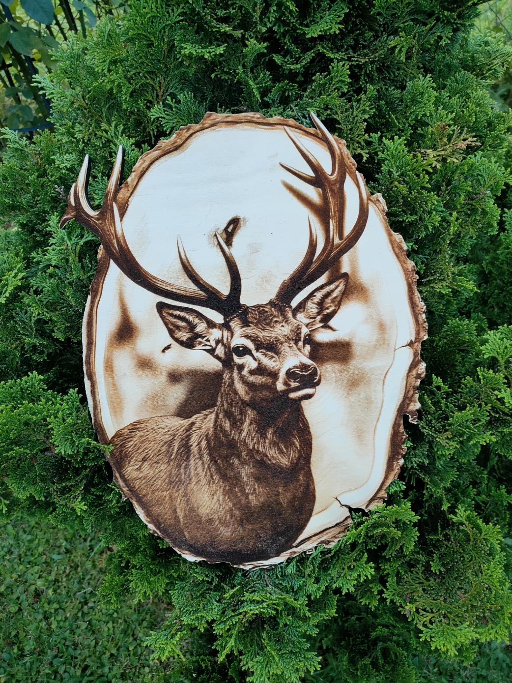 Motyw jelenia został trwale wygrawerowany na naturalnym plastrze drewna techniką laserową, dając realistyczny efekt wypalenia. Widoczne słoje i kora zachowują autentyczność materiału, tworząc niepowtarzalny wygląd każdego egzemplarza. Obraz jest gotowy do zawieszenia i stanowi wyjątkową ozdobę w stylu rustykalnym lub skandynawskim.