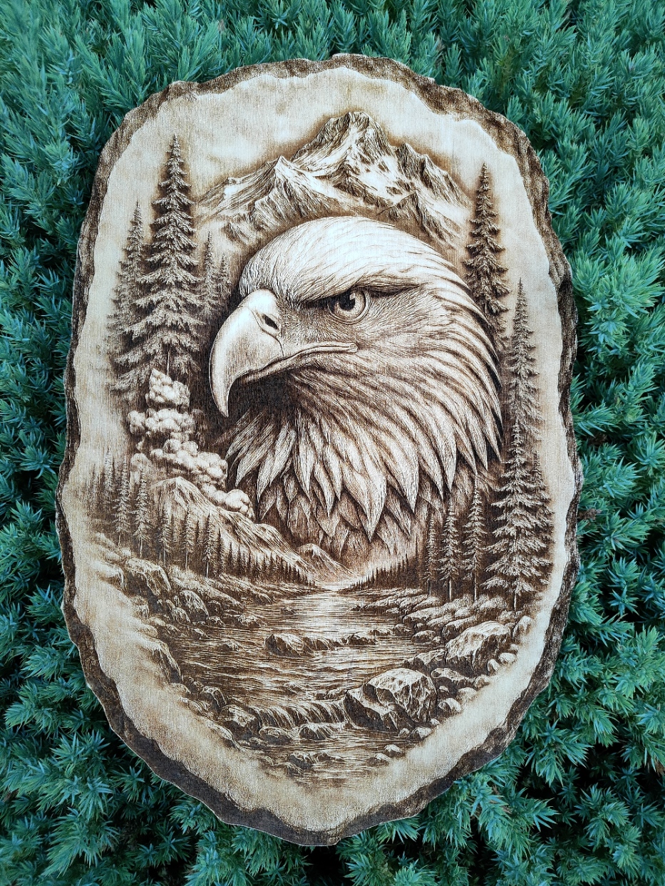 Majestatyczny orzeł wypalany w drewnie – symbol siły i wolności. Precyzyjna pirografia w naturalnym drewnie tworzy wyjątkową, trwałą dekorację do domu lub gabinetu.