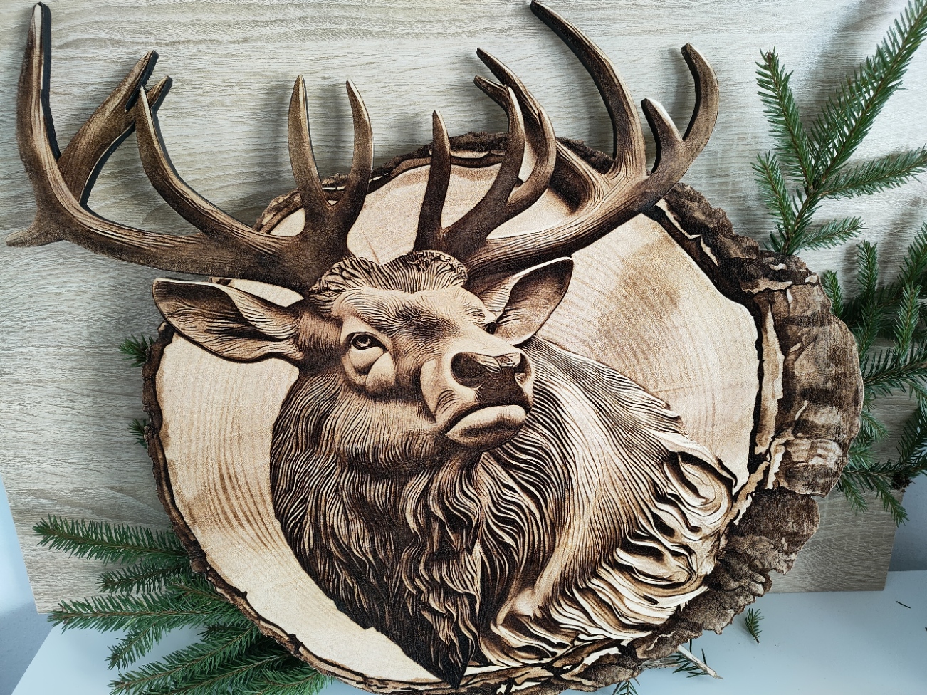 Obraz wykonany na grubym, 1-centymetrowym plastrze drewna metodą wypalania laserowego. Każdy detal – od poroża po strukturę futra – został odwzorowany z niezwykłą dokładnością. Ciepły odcień drewna i widoczna faktura słojów podkreślają naturalny charakter dzieła, a efekt 3D sprawia, że jeleń wygląda, jakby wychodził z powierzchni.