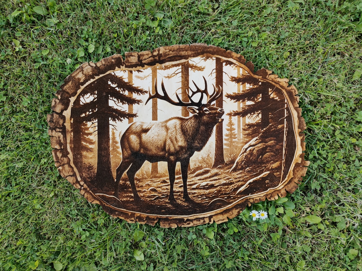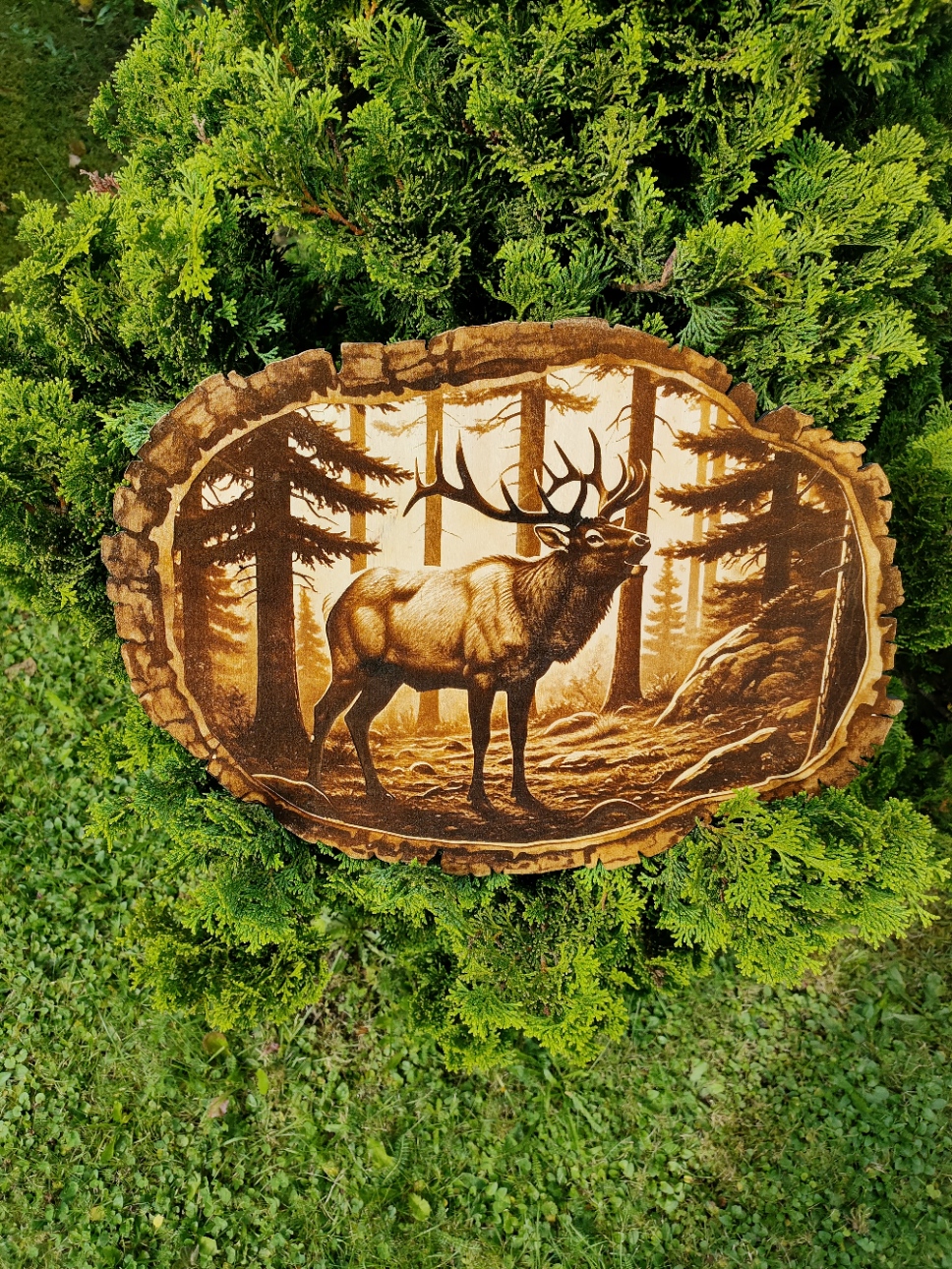 Motyw jelenia został trwale naniesiony na naturalny plaster drewna przy użyciu technologii grawerowania laserowego, dającej efekt realistycznego wypalenia. Widoczne słoje i nieregularny kształt drewna podkreślają jego autentyczny charakter. Każdy egzemplarz jest niepowtarzalny – zachowuje oryginalną strukturę i naturalny urok drewna.