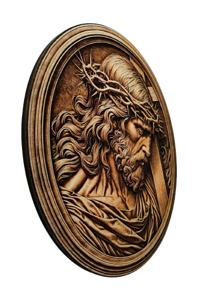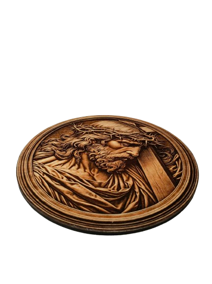 To połączenie tradycji i nowoczesnej technologii. Dzięki precyzyjnemu wypalaniu laserowemu, każdy detal twarzy i korony cierniowej jest odwzorowany z niezwykłą dokładnością. Drewno nadaje dziełu naturalny charakter, a jego ciepła barwa podkreśla duchowy wymiar przedstawienia. Każdy egzemplarz jest niepowtarzalny – układ słojów sprawia, że nie ma dwóch identycznych obrazów.
