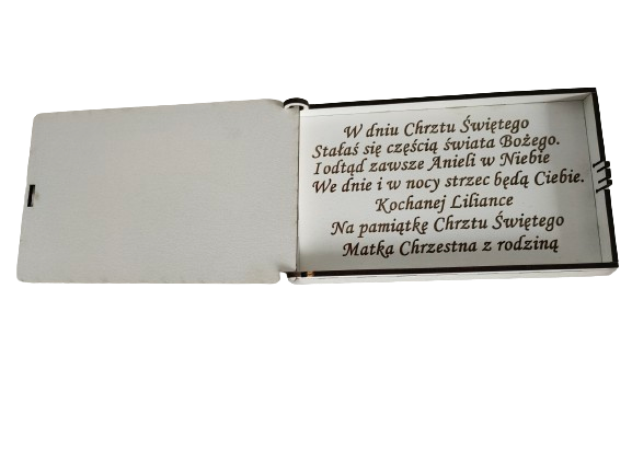Pudełko wykonane jest z naturalnej sklejki drewnianej. Delikatny grawer laserowy nadaje mu elegancki wygląd, a możliwość umieszczenia imienia dziecka czyni każdy egzemplarz unikalnym. Wnętrze idealnie mieści kopertę z pieniędzmi lub drobne pamiątki po uroczystości.