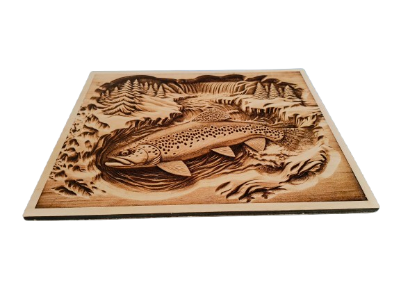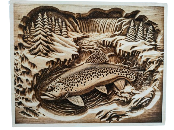 Ryba w górskiej rzece – wypalany w drewnie – drewniana dekoracja ścienna