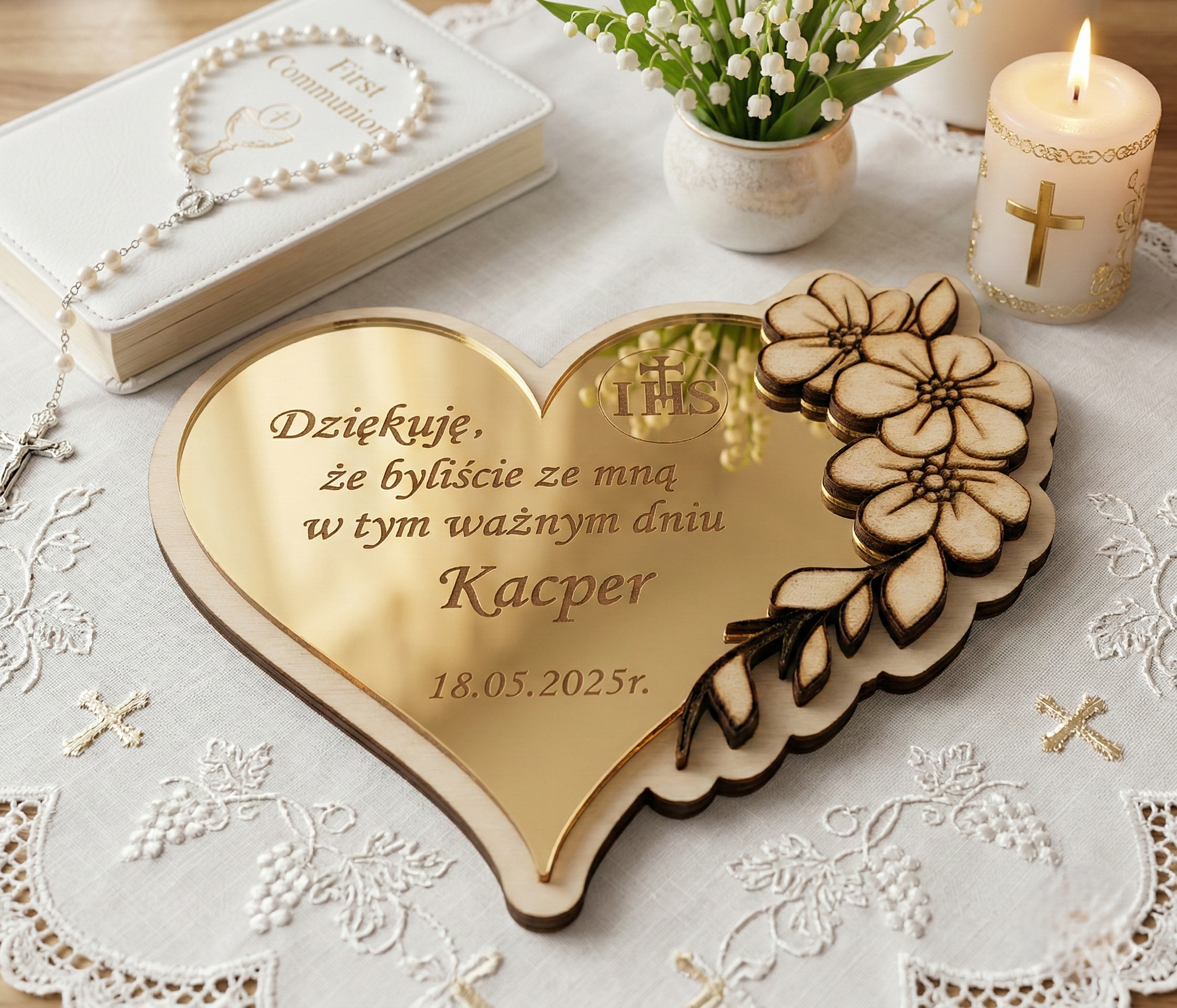 Pierwsza Komunia Święta to moment pełen radości i podniosłych chwil. Podaruj swoim gościom coś więcej niż zwykły drobiazg. Nasze autorskie podziękowanie w formie serca to esencja elegancji i nowoczesnego designu, która idealnie wpisuje się w trendy komunijne 2026 roku.