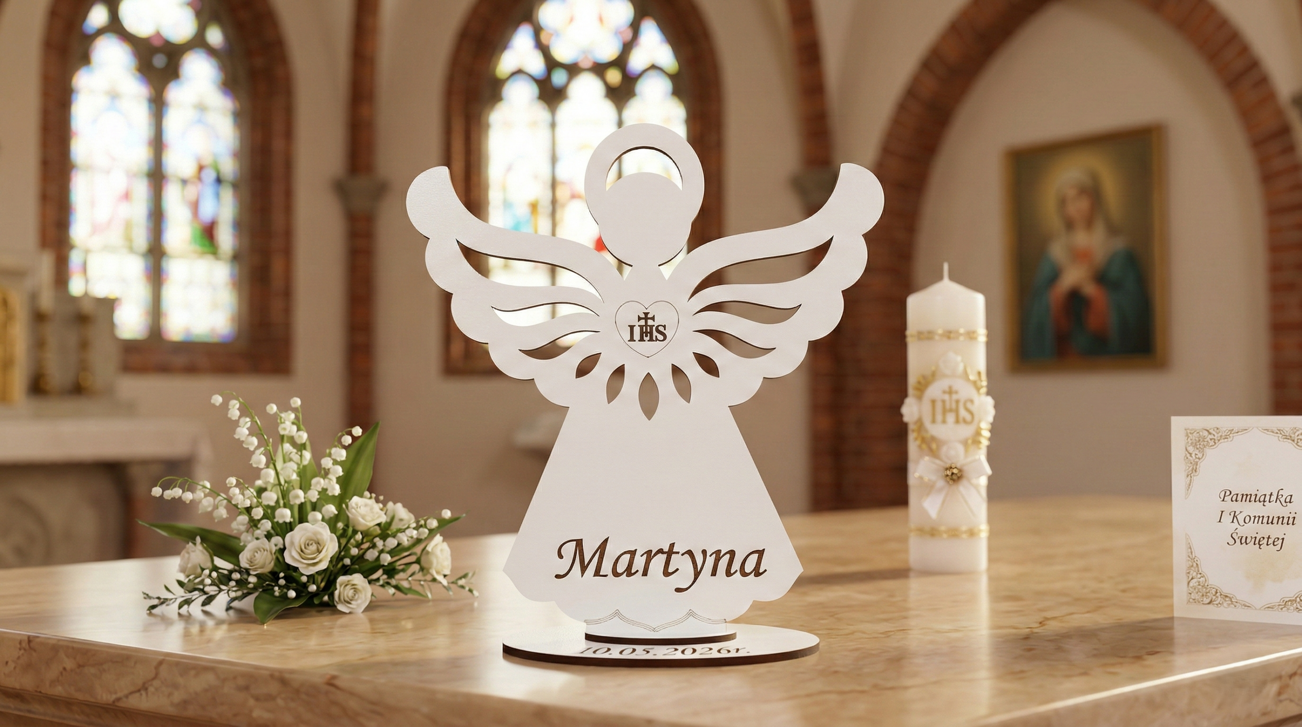 Ten anioł może służyć jako piękny element dekoracyjny ołtarza lub ławek w kościele podczas uroczystości komunijnej. Po ceremonii stanie się trwałą i wzruszającą pamiątką na biurku lub szafce nocnej dziecka, przypominając o tym ważnym wydarzeniu przez lata. To idealny sposób na upamiętnienie tego duchowego momentu w spersonalizowany sposób.