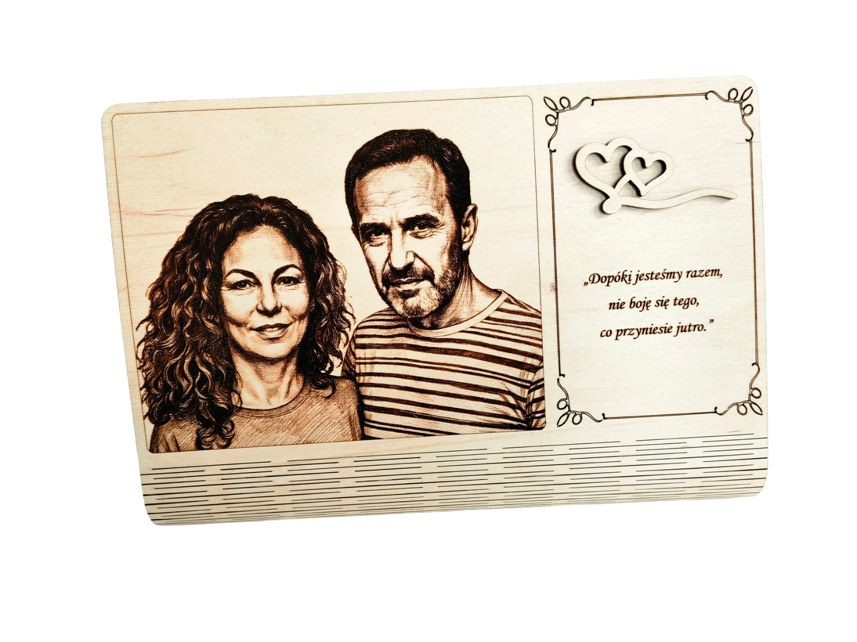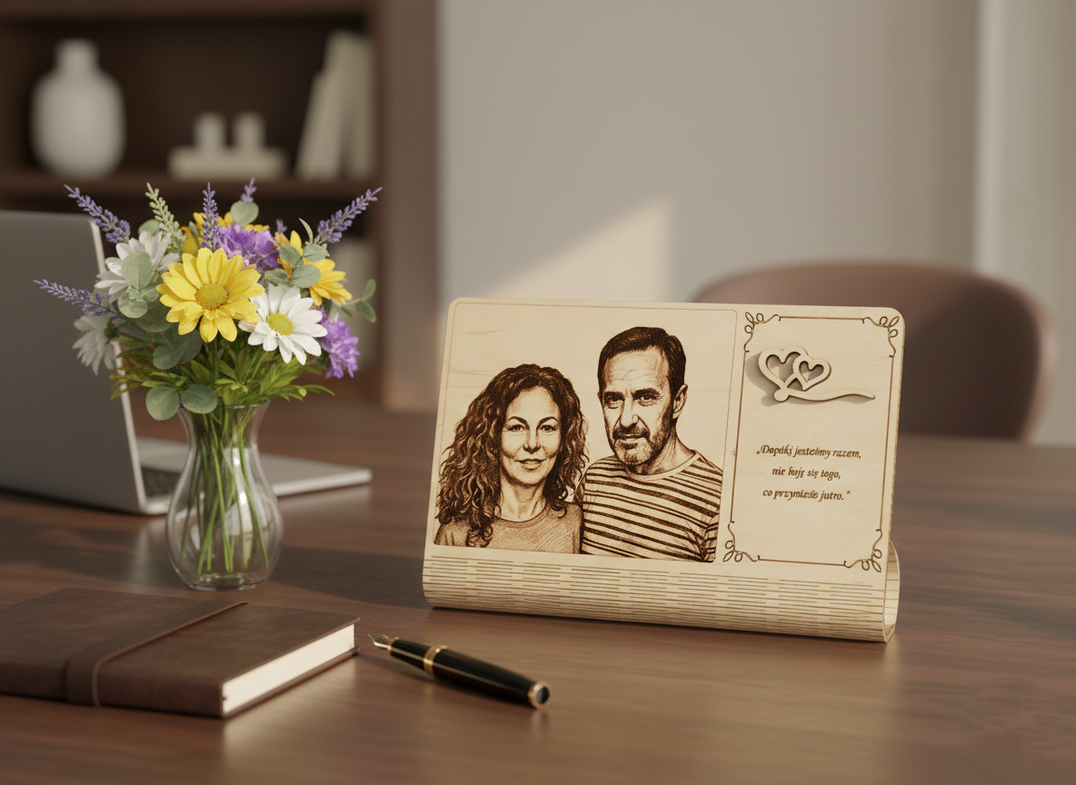 Szukasz prezentu, który nie wyląduje na dnie szuflady? Personalizowany portret małżeński grawerowany laserowo na drewnie to połączenie nowoczesnej technologii z naturalnym, ciepłym materiałem. To nie jest zwykły wydruk – to trwała pamiątka, którą dosłownie można poczuć pod palcami.