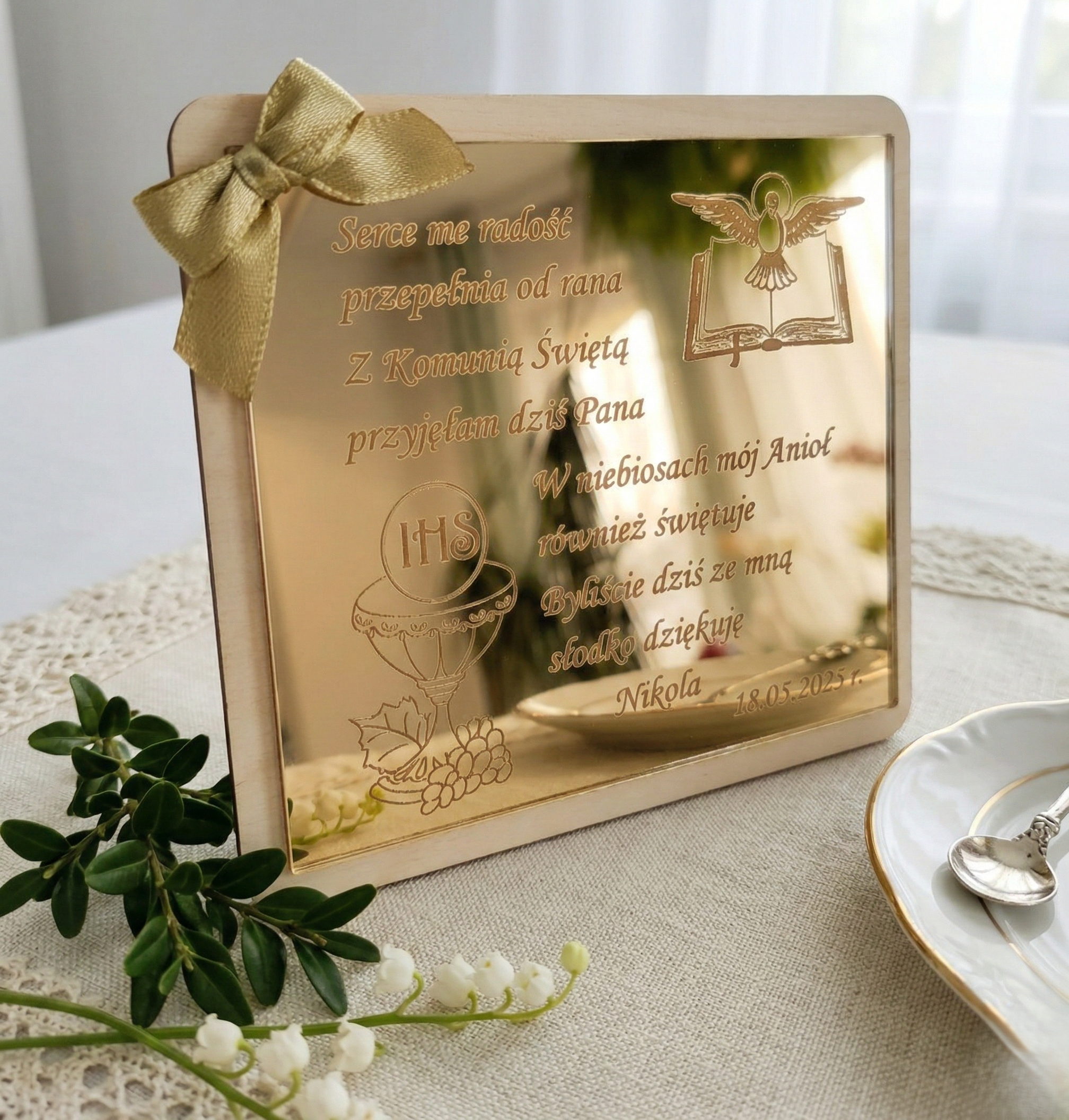 Wyraź wdzięczność w wyjątkowy sposób dzięki eleganckim podziękowaniom komunijnym z plexi lustrzanej. To połączenie blasku złotej lub srebrnej plexi z naturalnym drewnem, które tworzy unikalny efekt i podkreśla uroczysty charakter Pierwszej Komunii Świętej. Każdy element jest starannie grawerowany, ozdobiony kokardką.