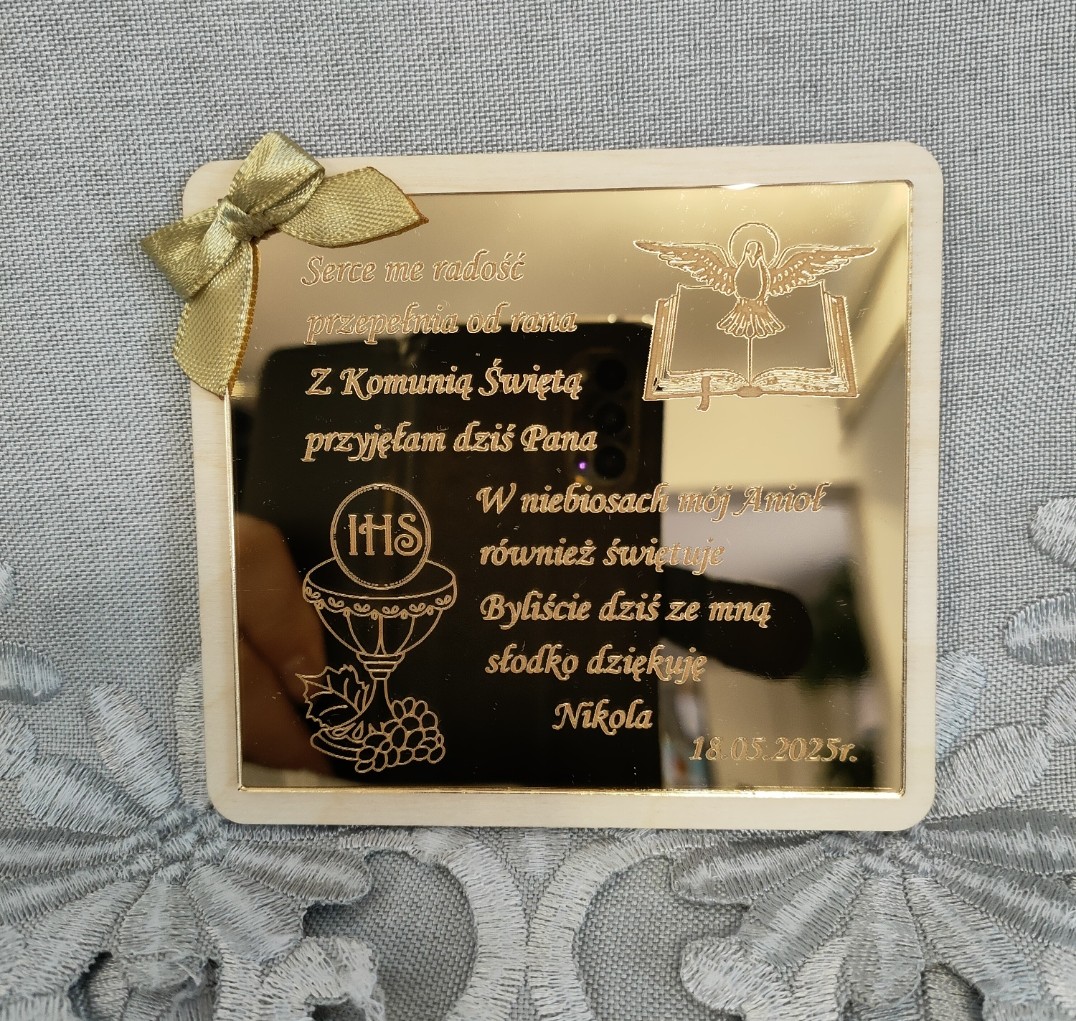 Podziękowania wykonane są z lustrzanej plexi podklejonej sklejką. Technika grawerowania laserowego pozwala na precyzyjne naniesienie imienia dziecka i daty komunii. Całość prezentuje się niezwykle elegancko i stanowi trwałą pamiątkę tej wyjątkowej uroczystości.