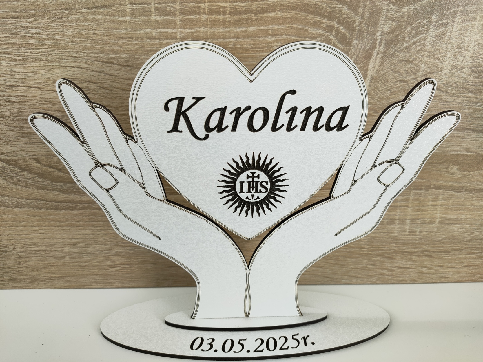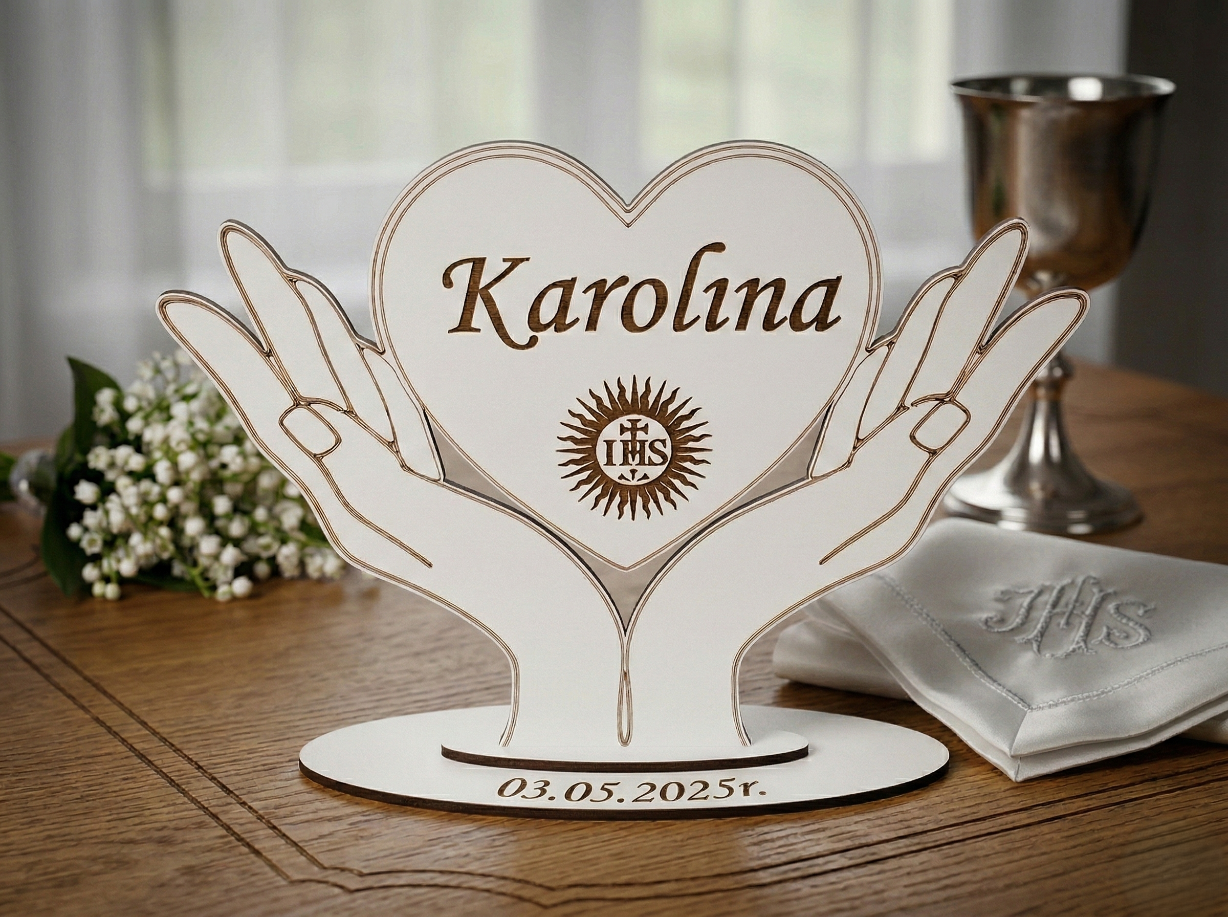 Serce w dłoniach dekoracja komunijna to elegancka ozdoba, wykonana z trwałej, białej płyty. Dzięki technologii grawerowania laserowego, na powierzchni serca możemy umieścić symboliczne dłonie trzymające serce, a także dowolny tekst, grafikę lub motyw komunijny, tworząc spersonalizowaną pamiątkę.