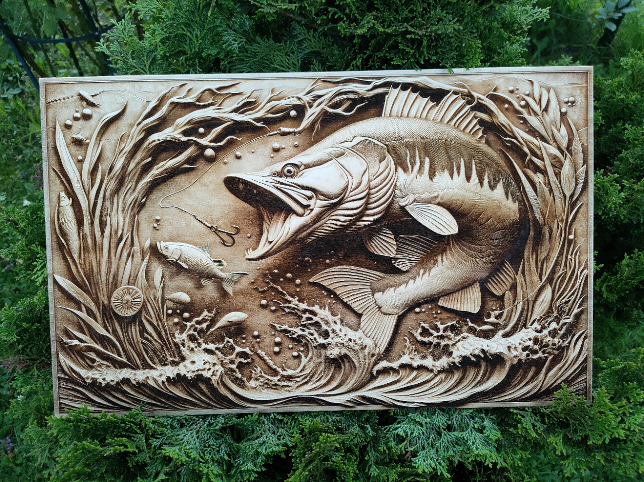 Szczupak w naturalnym środowisku – Drewniana dekoracja na ścianę – wypalane w drewnie