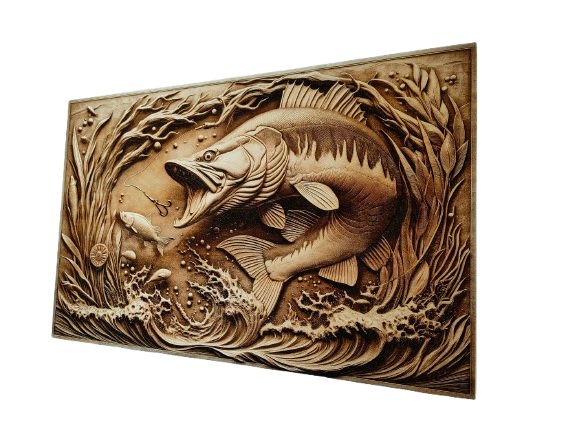 Odkryj fascynujący podwodny świat dzięki wyjątkowemu obrazowi wypalanemu w drewnie, przedstawiającemu szczupaka w jego naturalnym środowisku. To drewniana dekoracja na ścianę, która łączy piękno natury z precyzją nowoczesnej technologii grawerowania laserowego.