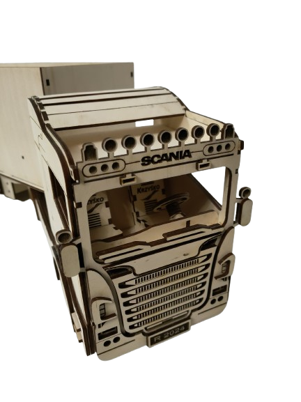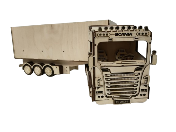 Model ciężarówki wykonany jest z wysokiej jakości sklejki drewnianej. Grawer laserowy nadaje mu precyzyjne detale i elegancki wygląd. Naturalny kolor drewna podkreśla strukturę słojów, a minimalistyczny design sprawia, że produkt prezentuje się stylowo i solidnie.