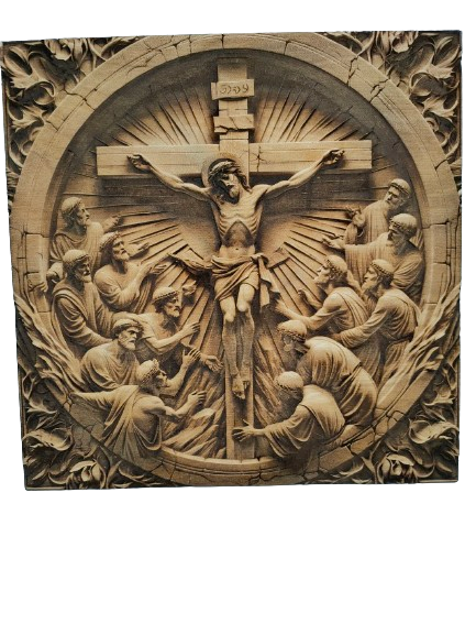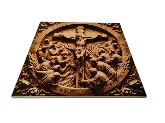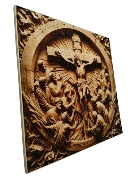 Obraz wykonany z wysokiej jakości sklejki o grubości 10 mm zachwyca naturalnym kolorem i strukturą drewna. Technika wypalania laserowego pozwala odwzorować każdy detal sceny Ukrzyżowania z niezwykłą dokładnością, tworząc subtelny efekt przestrzenny. Zabezpieczenie bezbarwnym lakierem wodnym podkreśla fakturę drewna i zapewnia trwałość na lata.