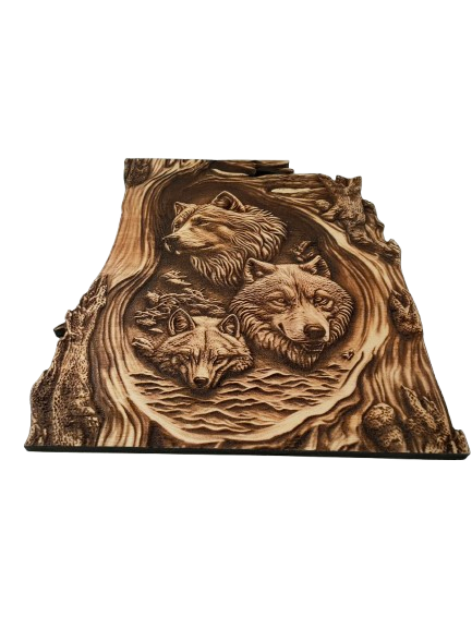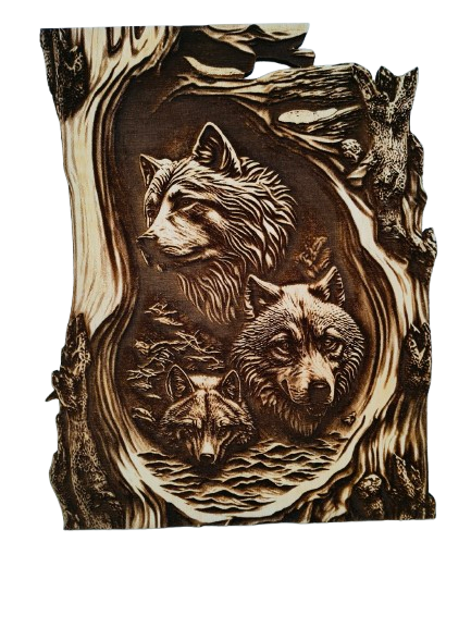 „Wilki 3D” wypalane w drewnie to wyjątkowy obraz, który łączy nowoczesną technikę z siłą natury – doskonały wybór dla tych, którzy cenią ręczne wykonanie i niepowtarzalny styl.