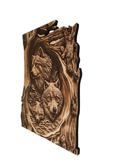 Odkryj wyjątkowe połączenie natury i sztuki w naszej drewnianej dekoracji z wilkami 3D. Obraz wykonany techniką wypalania laserowego na naturalnym drewnie sosnowym zachwyca detalami i głębią, tworząc realistyczny efekt przestrzenny. To niezwykły akcent, który doda Twojemu wnętrzu siły, spokoju i elegancji.