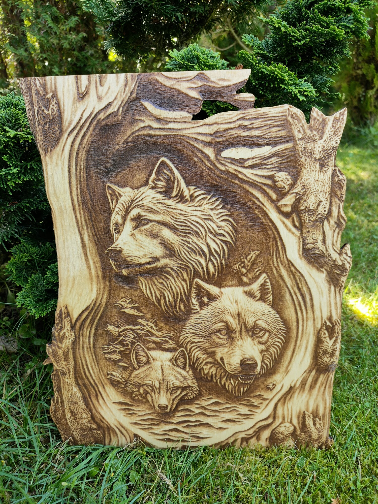 - Efekt 3D – wilki wydają się wychodzić z powierzchni drewna, tworząc niezwykły realizm.