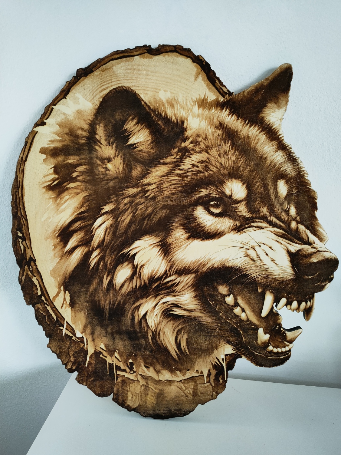 Obraz wykonany jest z wysokiej jakości drewna lipowego, o widocznej strukturze i ciepłym odcieniu. Dzięki precyzyjnemu grawerowi laserowemu oraz cieniowaniu uzyskano efekt trójwymiarowości, który sprawia, że wilk zdaje się wychodzić z powierzchni drewna. Subtelne wykończenie lakierem chroni dekorację i podkreśla naturalne piękno materiału.