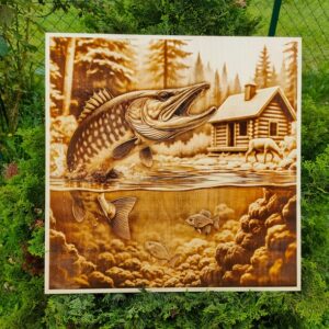 Szczupak w naturalnym środowisku – drewniana dekoracja na ścianę – wypalane w drewnie